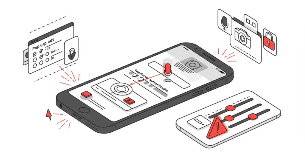 - Camera, microphone, or location permissions granted to unknown applications