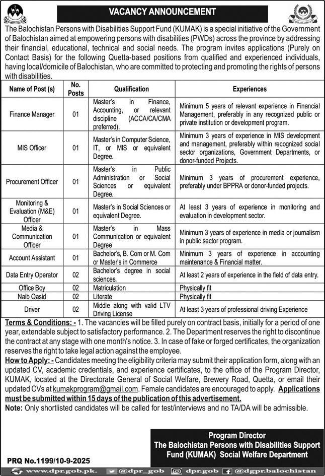 The Social Welfare Department recently announced the number of jobs for individuals in Balochistan. This exciting opportunity was highlighted on 12 September 2025. The jobs are centered at Quetta on the Bawery Road with the offer to provide a prestigious government opportunity in order to empower the different communities in Balochistan, including the chance for disabled individuals. The offered roles and the opportunity are part of the Balochistan Persons With Disabilities Support Fund KUMAK, and are committed to fostering the development and provision of a stable career. These opportunities align with the mission of the department to offer administrative and other technical roles to enhance the social welfare services.