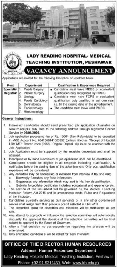 The main role mentioned in this notice is specialist registrar. This position suits experienced medical professionals who already completed required qualifications and now want to serve in senior clinical roles. In the next sections you will see eligibility rules, required papers, vacancy details, and how to apply step by step. Please read everything slowly because small mistakes sometimes cause problems during submission. All key information related to Lady Reading Hospital recruitment is explained in simple words below.