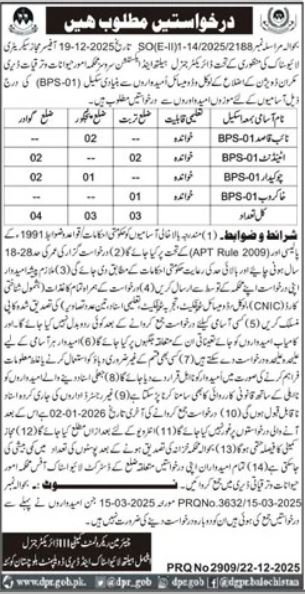 The department has announced several support staff vacancies. These posts are available in different areas of Makran division. All available positions are listed below exactly as mentioned.