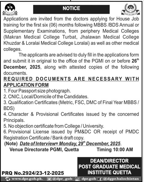 The available roles include house job training and post graduate training for eligible medical graduates. Candidates who meet the education and other basic requirements are encouraged to review all details carefully. Information about eligibility required documents and other important points are explained below for Post Graduate Medical Institute Quetta Job 2026 so applicants can apply with confidence.