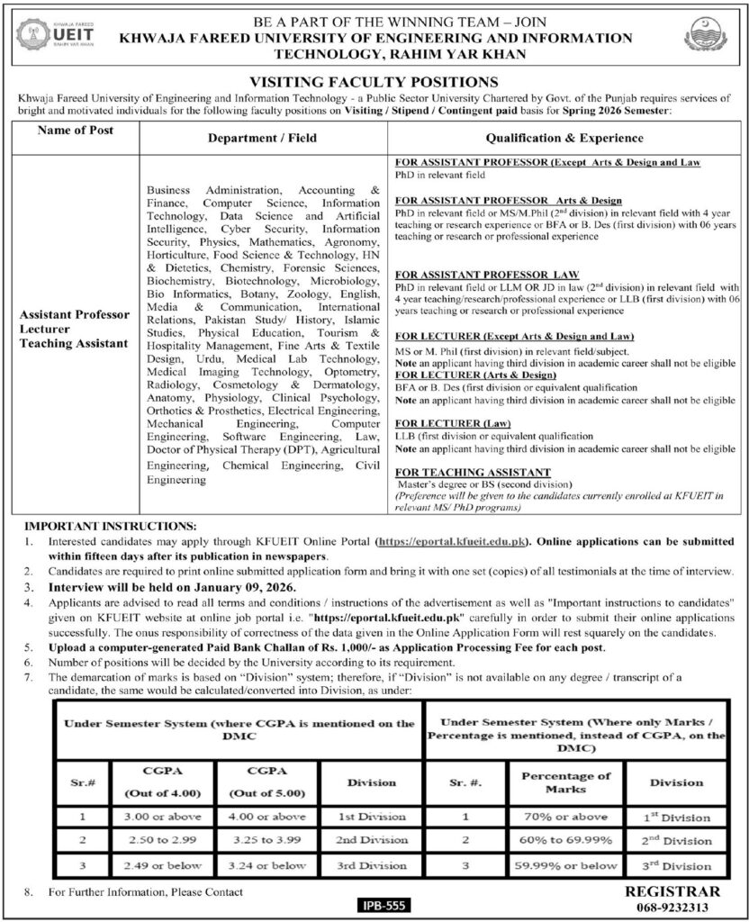 Khwaja Fareed University Of Engineering & Information Technology has posted multiple jobs for individuals. These positions were shared on 25 December, 2025 and are meant for qualified people who want to work in a respected public sector university. This recruitment is important because it supports higher education growth and offers stable govt careers in Punjab.